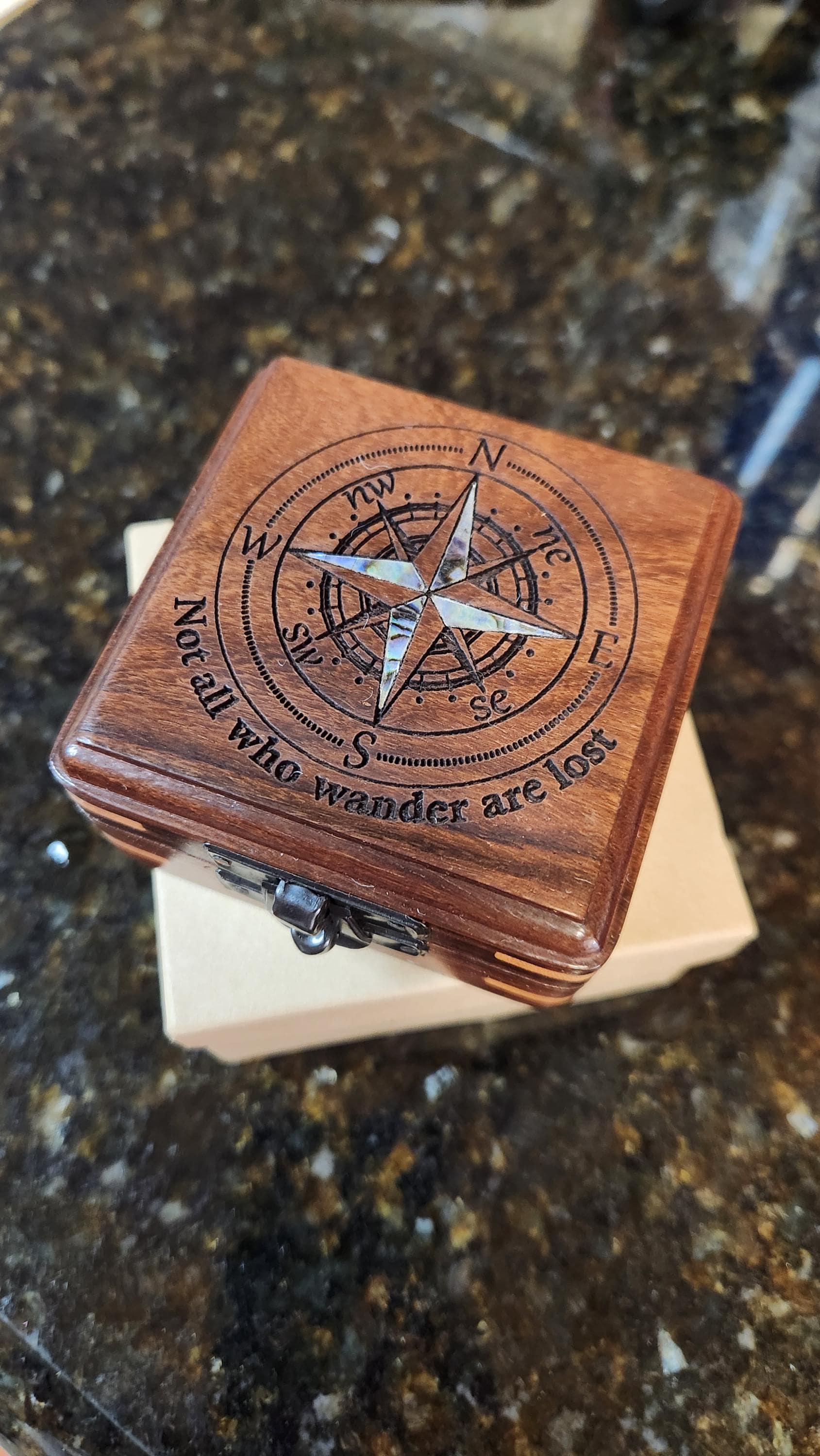 I can't say enough good things about this shop - from the customer service to the finished product! Ozzy wonderful to work with, made the compass exactly as I wanted and it shipped very quickly! There is a lot of attention to detail here - from the engraved wooden case so beautifully done, with lovely mother of pearl inlay on the top and wooden inlay on the sides to the quality leather pouch perfectly made to attach to a belt for a day of hiking. The compass feels substantial, works perfectly and looks lovely with the engravings we selected. It has an old world charm to it that I love. And all this came beautifully packaged in a gift box! I highly recommend this seller and this item!